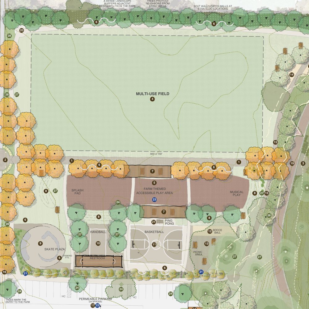 The design team then took all of the feedback and created a single concept plan. This latest plan envisions a multi-use sports field, basketball court, handball court, bocce ball court, skateboard plaza, playground, picnic areas, walking paths, fitness nodes, restrooms and a small parking lot. It also includes enhancement of the existing habitat and protection of the Sister Witness Tree.