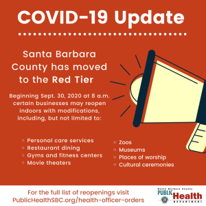 The Santa Barbara County Public Health Department has issued Health Officer Order No. 2020-12.9 allowing more businesses to reopen indoors with modifications and capacity limits, in accordance with the State’s Blueprint for a Safer Economy. As of September 29, 2020, Santa Barbara County has met the State’s red tier case rate and positivity rate criteria for two consecutive weeks. As a result, the risk of COVID-19 spread in Santa Barbara County has been downgraded, effective immediately, from widespread to substantial, allowing movement from the purple tier to the red tier.