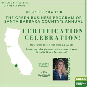 Please join the Green Business Program on Wednesday, March 24th from 12:00 – 1:30 p.m. for the 12th Annual, and first virtual, Green Business Program Certification Celebration. The Green Business Program of Santa Barbara County will be honoring an impressive group of businesses that have achieved Green Business certification during this challenging year. Special Guest U.S. Congressman Salud Carbajal, representing the 24th Congressional District, will be joined by Kylie Wagner from Kiss the Ground who will serve as the Keynote Speaker, sharing her passion for regenerative agriculture.