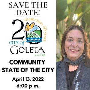 We are excited to hold the Fifth Annual Community State of the City in-person! Last year we held a successful virtual event, but we missed seeing everyone. This year’s Community State of the City will be on Wednesday, April 13 at 6:00 p.m. This is a free community event to learn more about what is happening at City of Goleta. Stay tuned for the location.