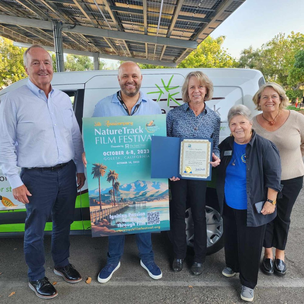 City Council and NatureTrack Film Festival representatives with the Certificate of Recognition from the September 19, 2023, City Council meeting. Pictured left-to-right: Greg Parker (Land Trust for Santa Barbara County Board of Trustees), District 2 Councilmember James Kyriaco, Councilmember Stuart Kasdin, Mayor Paula Perotte, Sue Eisaguirre (Founder and Executive Director of NatureTrack), Gareth Kelly (Development Director for the NatureTrack Film Festival), District 1 Councilmember Luz Reyes-Martín, Maureen “Mo” McFadden (NatureTrack Communications Director), and Carrie Mullen (Development and Communications Director for the Land Trust for Santa Barbara County)