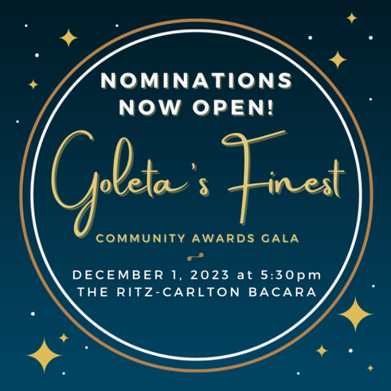 The Santa Barbara South Coast Chamber of Commerce will recognize Goleta’s Finest during the annual community awards gala on December 1, 2023, at 5:30 p.m. at the at the Ritz-Carlton Bacara (8301 Hollister Avenue). If you know someone deserving of special recognition for their community contributions, now is your opportunity to nominate them for these prestigious awards. To ensure your recommendations are considered, please submit a completed nomination form by October 6.