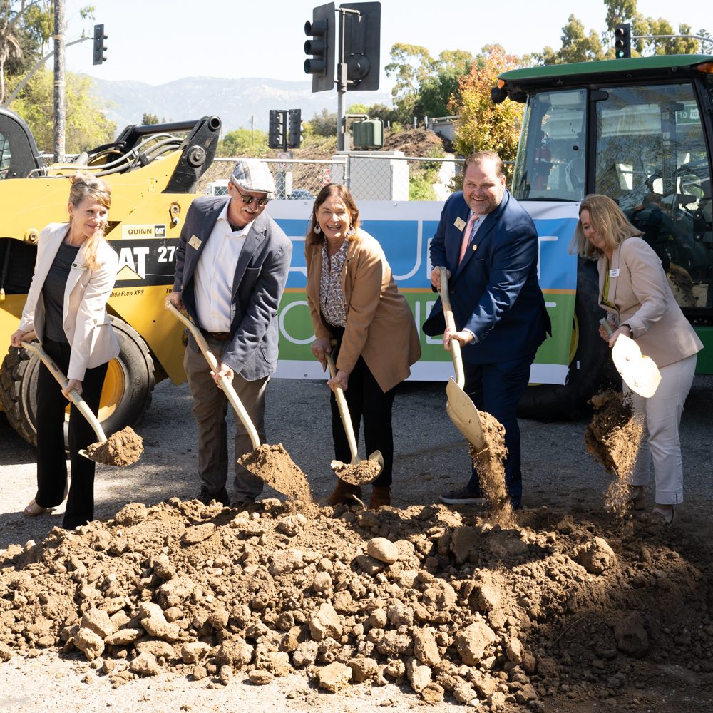 Project Connect Groundbreaking Speakers Pose with Shovels – pictured left-to-right: Meg Henry Caltrans District 5 Project Manager, Councilmember Kyle Richards, Mayor Paula Perotte, Congressman Salud Carbajal, Councilmember James Kyriaco (District 2), Santa Barbara County Supervisors Joan Hartmann (District 3) and Laura Capps (District 2) and Marjie Kirn with Santa Barbara County Association of Governments