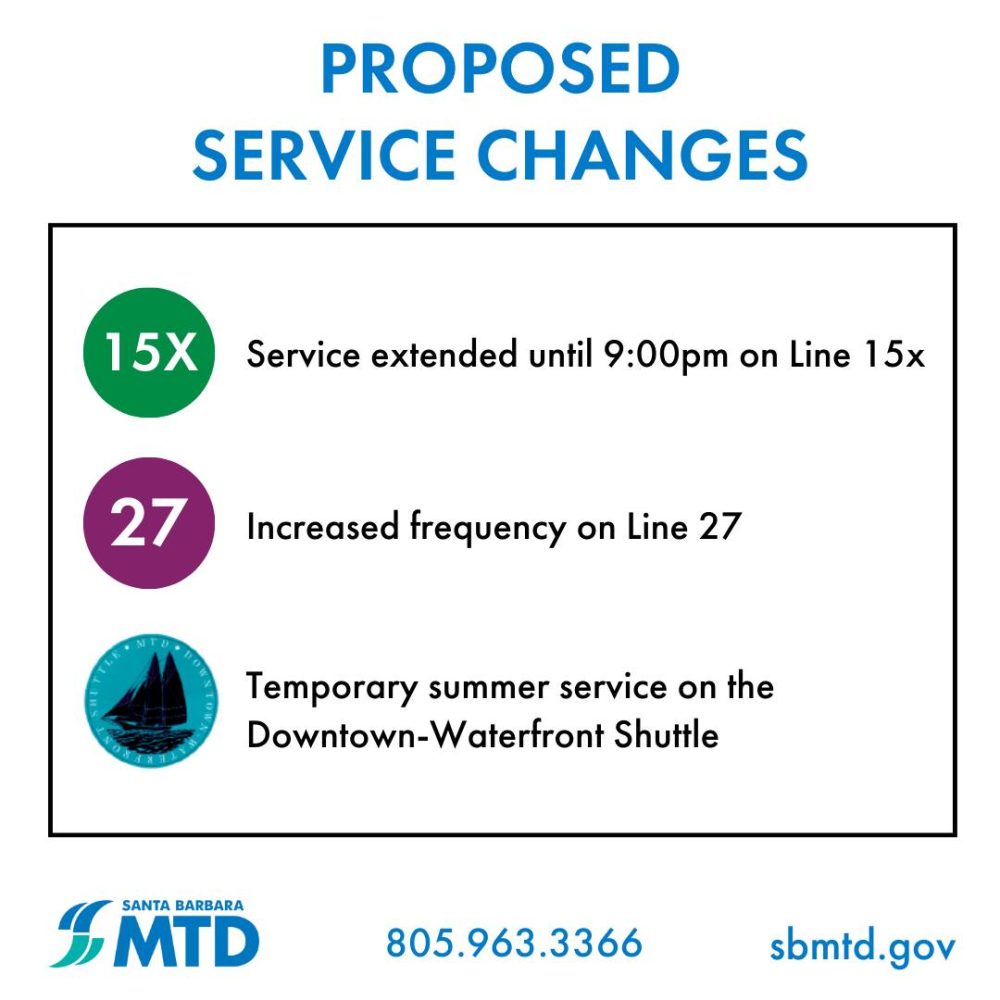 For questions on proposed service changes, the public may contact Santa Barbara MTD at 805-963-3364 or email info@sbmtd.gov.
