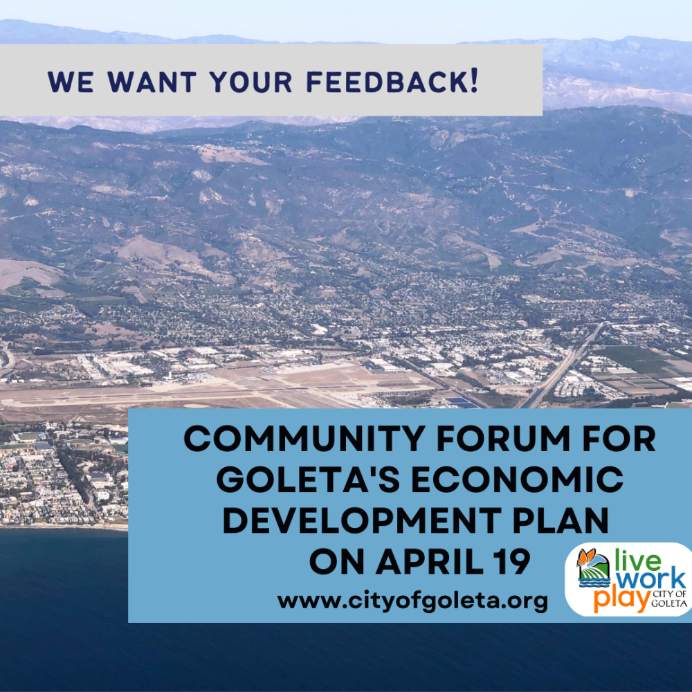 A thriving economy is a critical component to the success of a city. That’s why the City of Goleta is developing a new Five-Year Economic Development Strategic Plan and wants community input. Please join us for a hybrid Community Forum on April 19 from 5:30 – 7:00 p.m. in City Hall Council Chambers (130 Cremona Drive) and via Zoom. We will be reviewing the Draft Plan and want your input. Specifically, we want to know: Is there anything that is missing? Should anything be adjusted? Which elements are on the right track?