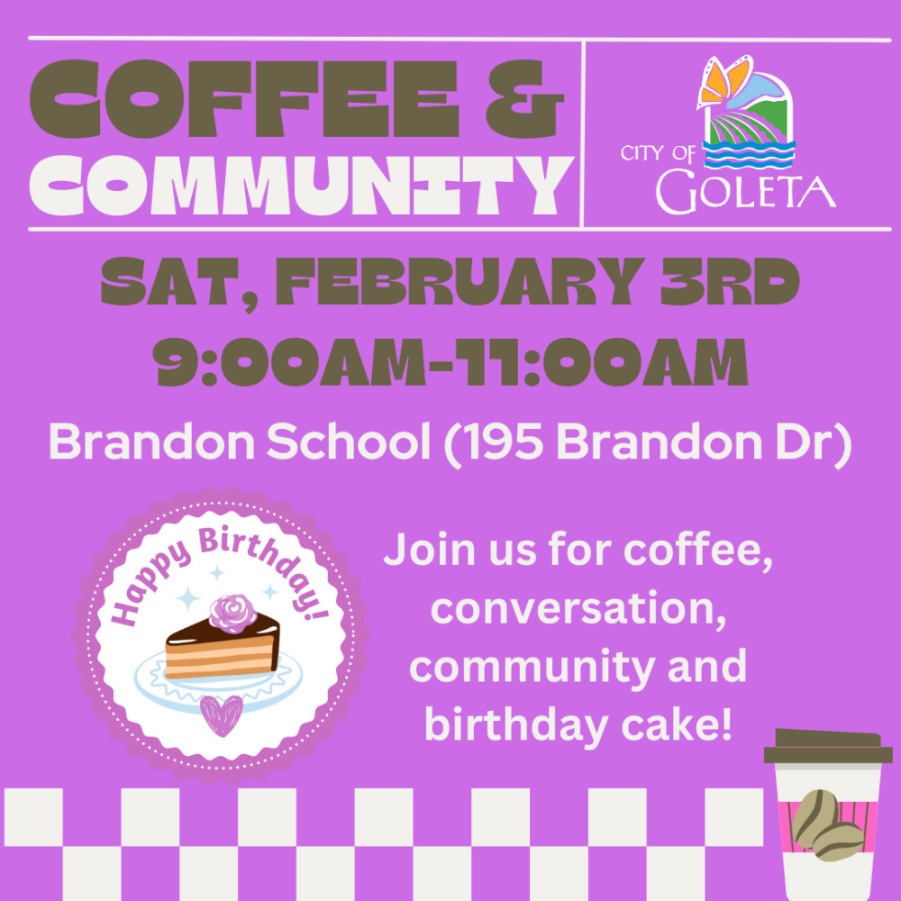 It’s not often that you feel good about eating cake for breakfast, but we have the perfect excuse. We are celebrating the City’s 22nd birthday at our upcoming Coffee and Community (Café y Comunidad) event on Saturday, February 3 from 9:00 a.m. to 11:00 a.m. at Brandon School (195 Brandon Drive). We will be serving up birthday cake from Anna’s Bakery and kids who attend can make birthday cards for the City to be displayed at the Goleta Valley Library. This bilingual event will have live Spanish interpretation.