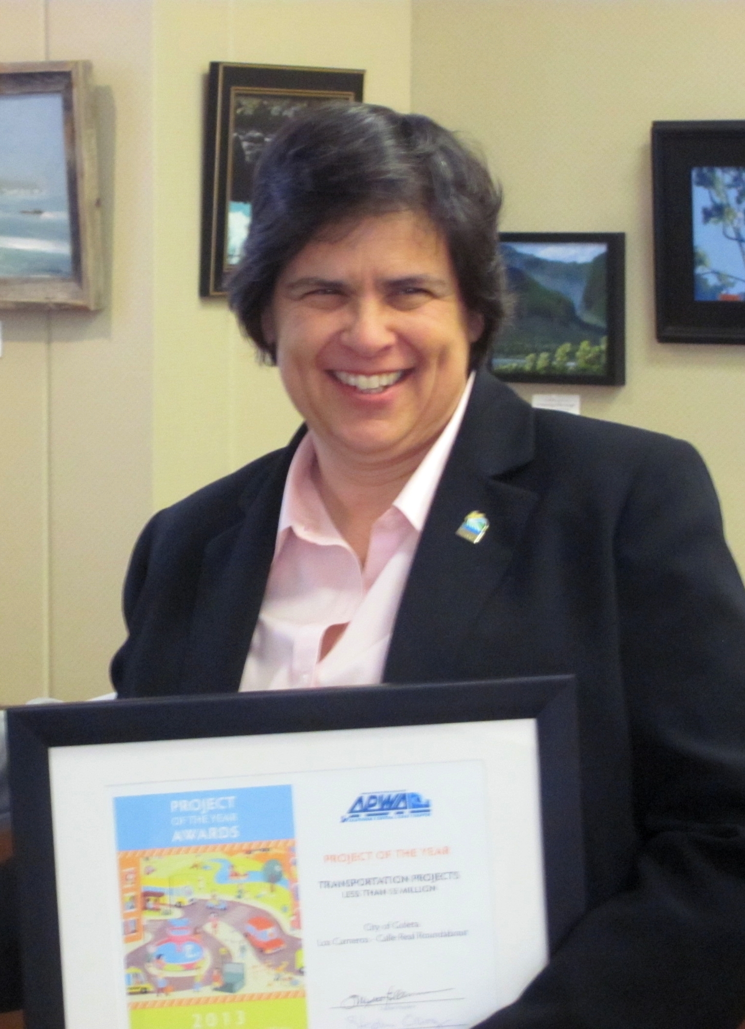 The City of Goleta received a ‘Best in Category’ award for the roundabout at Los Carneros and Calle Real from the American Public Works Association, Central Coast of California Chapter. The award was given in the category of Transportation Projects under $5 million. Wallace Group designed the roundabout and Granite Construction built it. It was completed on time and under budget. This is the second award the City has received from APWA. Rosemarie Gaglione was the City’s project manager.