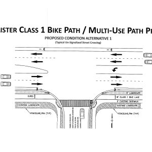 - Alternative 1 proposes a Class I bike path which is separated from the sidewalk. In this case the five foot sidewalk would remain and a separate Class I bike path – eight feet wide, would be added between the sidewalk and the existing Class II bike lane. A five foot curbed on each side landscape buffer area would be located between the Class II bike lane and the Class I bike path. The Class I bike path would be asphalt surface at the same level as the street. It would not be striped. Two-way bike travel will be allowed in the Class I bike path.