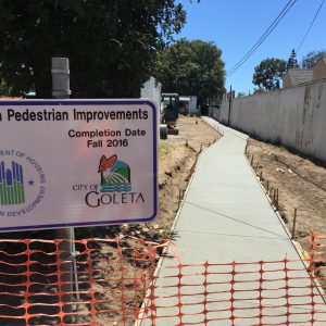 In order to improve pedestrian safety, a number of upgrades are being made to the pathway between the Goleta Valley Community Center and the Boys & Girls Club. Existing fencing along the front and back parking lots has been removed and path lighting will be installed from Hollister Avenue to the back of the property where the Boys & Girls Club facility is located. The contractor has replaced the front half of the sidewalk with a new concrete sidewalk and will be making additional minor repairs around the trees. In addition, a drainage swale (a vegetated ditch with native grasses to convey storm water runoff that allows some infiltration of that water into the ground) will be installed between the path and parking areas. The project began in mid-July and construction is expected to take about two months.