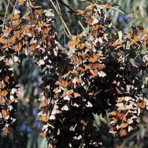 The Monarchs typically stay mid-November to mid-February, with the population peaking near the end of December. They are most active in February, when they mate before leaving the Grove. If you come in the morning or on cooler days, you will see the monarchs staying in clusters. If you prefer to see them more active, come on a warmer day or in the afternoon when they tend to be flying and puddling (gathering water and minerals from the soil) in and around the Grove.