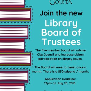 Do you love the Goleta Valley Library? Then apply to serve as one of five members on the Library Board of Trustees. The role of the Board is to advise the City Council and increase citizen participation in library issues by analyzing current needs, considering goals, anticipating future needs and problems, acting as a liaison, acting as a sounding Board, and to help develop consensus for advisement to the City Council. The Board will meet at least once a month. There is a $50 stipend per month.