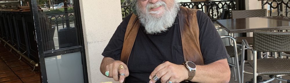 Pictured: Local musician Eddie EagelFeather enjoying lunch outside at Los Arroyos Goleta Mexican Restaurant & Take Out