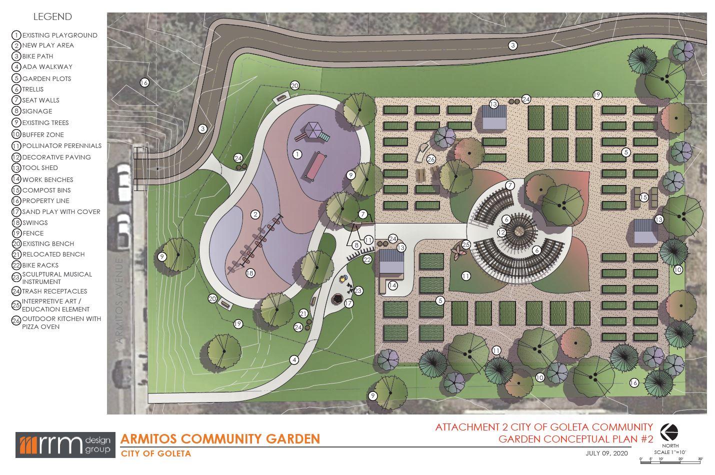 Goleta is getting its first community garden! Located in Armitos Park behind Jonny D. Wallis Neighborhood Park, a conceptual design was recently selected at the July 21 City Council meeting. Garden features include: raised garden beds of varying sizes, demonstration area/outdoor classroom, picnic area, tool sheds, composting area and landscaping. The garden will also feature unique amenities such as a pizza oven, flower bed in the design of a butterfly to help educate visitors on the importance of pollinators, and musical chime instruments for children to play. The project also includes improvements to Armitos Park such as adding swings and sandboxes to expand the play area, and a bike path extension connecting Armitos Park to Jonny D. Wallis Neighborhood Park.