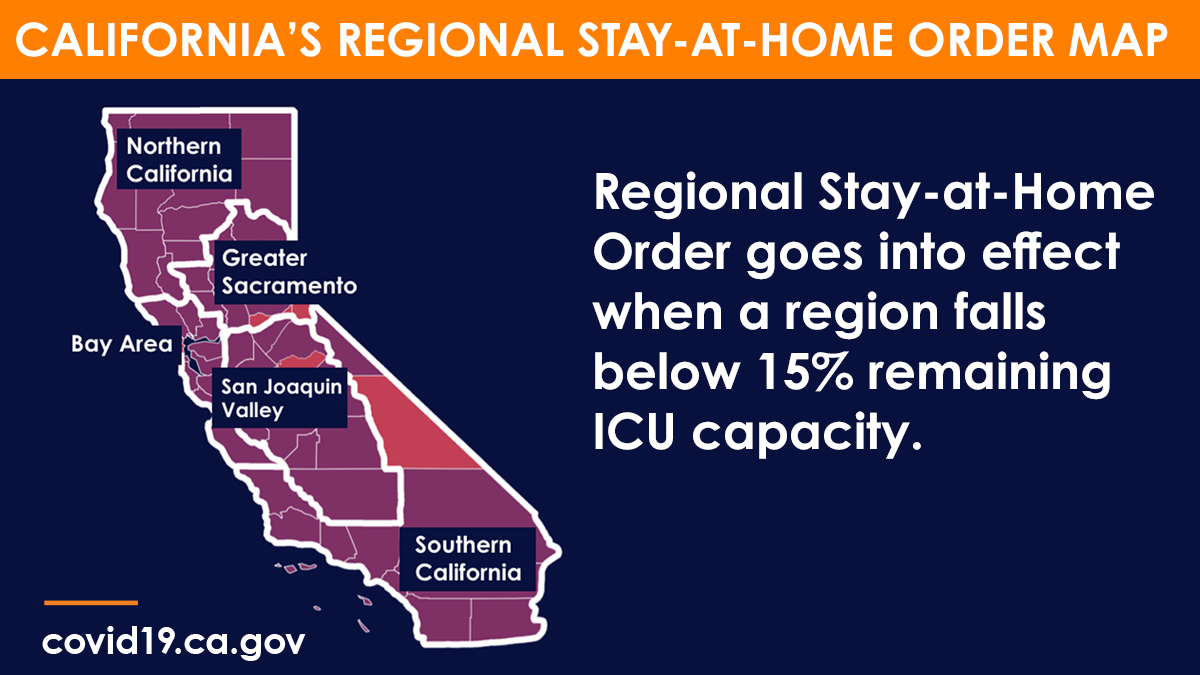 As you are aware, there is a Regional Stay-At-Home Order in place.  The Southern California Region of the State’s COVID-19 monitoring system began its Stay-at-Home Order on Sunday, December 6, 2020, at 11:59 p.m. and is expected to remain in place for at least three weeks before re-evaluation by the State the week of December 28, 2020.