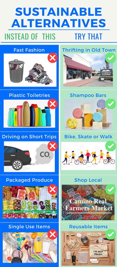 1. Instead of buying from stores that sell fast fashion, try purchasing secondhand clothing at one of the great thrift stores in Old Town Goleta. You can find cool and unique pieces, decrease the market for cheaply made clothing, and support local businesses. You can find a list of Green Businesses in Goleta here.