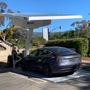 Pictured: EV ARC™ 2020 by BEAM Global newly installed in the Goleta City Hall parking lot and charging a car.