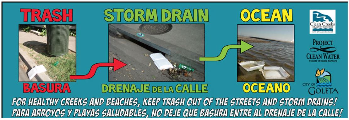 The City of Goleta Environmental Services Division would like to share some tips to help protect our watersheds during the rainy season. As winter approaches, let’s stop water pollution and keep our storm drains and creeks clean! Winter rains produce stormwater runoff which is rain that does not soak into the ground and flows over land and other surfaces. Stormwater runoff can carry trash and pollutants into storm drains, which flow directly to creeks, rivers, and the ocean without any treatment. The trash and chemicals in the runoff pose a threat to wildlife and water quality.