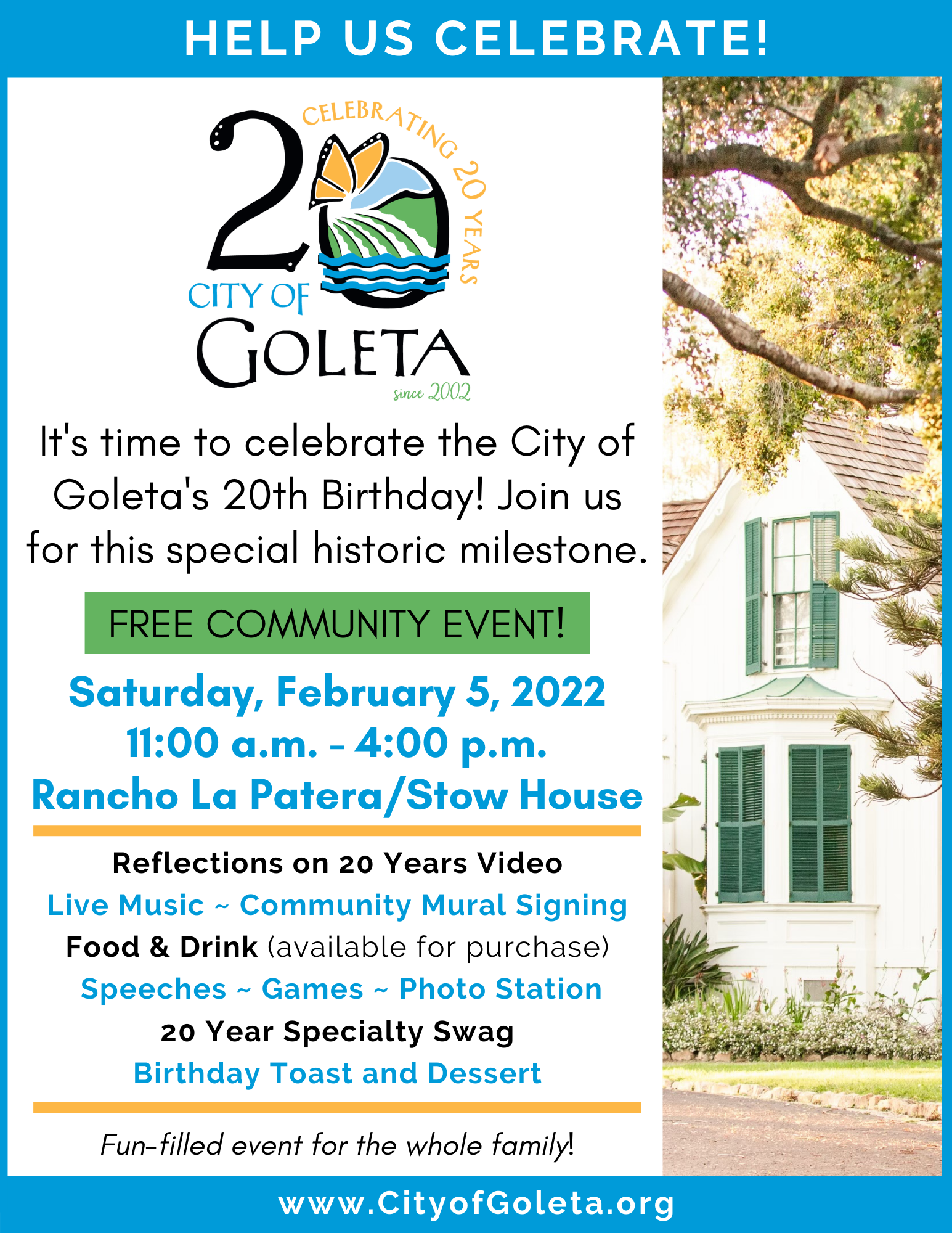 The City of Goleta is turning 20 and we want to celebrate with you! Please save the date for Saturday, February 5, 2022, to celebrate this special historic milestone with us. The community is invited to this free event from 11:00 a.m. – 4:00 p.m. at Rancho La Patera and Stow House (304 N. Los Carneros Road). Come for the entire time or just part of it. You won’t want to miss this fun-filled event where we premiere our video reflecting on 20 years of being a City. There will also be live music, food and drink (available for purchase), a birthday toast with dessert, community mural signing, and more!