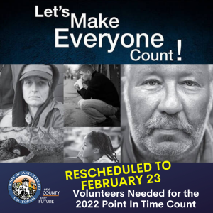 The countywide Homeless Point-in-Time Count is scheduled for Wednesday, February 23. The semi-annual Point-In-Time Count is the annual count of individuals and families experiencing homelessness on a given day. The Count could not be done without the help of the community. Teams of volunteers will canvas assigned routes throughout the county and briefly document who is experiencing homelessness. This information is used to plan local homeless assistance systems, justify funding, and raise public awareness. Volunteers will be trained to help count on the survey day. To volunteer, please sign up at https://countyofsb.pointintime.info/.