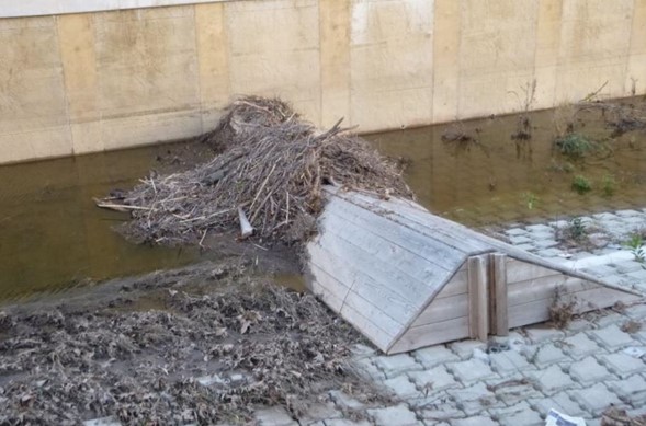 Pictured (above): San Jose Creek Channel – Trapped sediment with vegetation in between weirs, 2019 and (below): San Jose Creek Channel – Wooden weirs with trapped debris, 2019