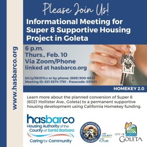 The Housing Authority of the County of Santa Barbara, in partnership with the County of Santa Barbara and City of Goleta, is pleased to invite members of the community to a virtual meeting at 6 p.m. Thursday, February 10 on the proposed permanent supportive housing development project at 6021 Hollister Avenue in Goleta, currently the site of a Super 8 motel. This proposed development would serve to help address the human and societal problem of people experiencing, or at risk of, homelessness.