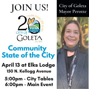 Goleta’s biggest night of the year is almost here! We hope you will join us on Wednesday, April 13 from 5:00 to 7:00 p.m. for Goleta’s 5th Annual Community State of the City. The free community event will be held at the Elks Lodge (150 N. Kellogg Avenue). Spanish interpretation will be available.