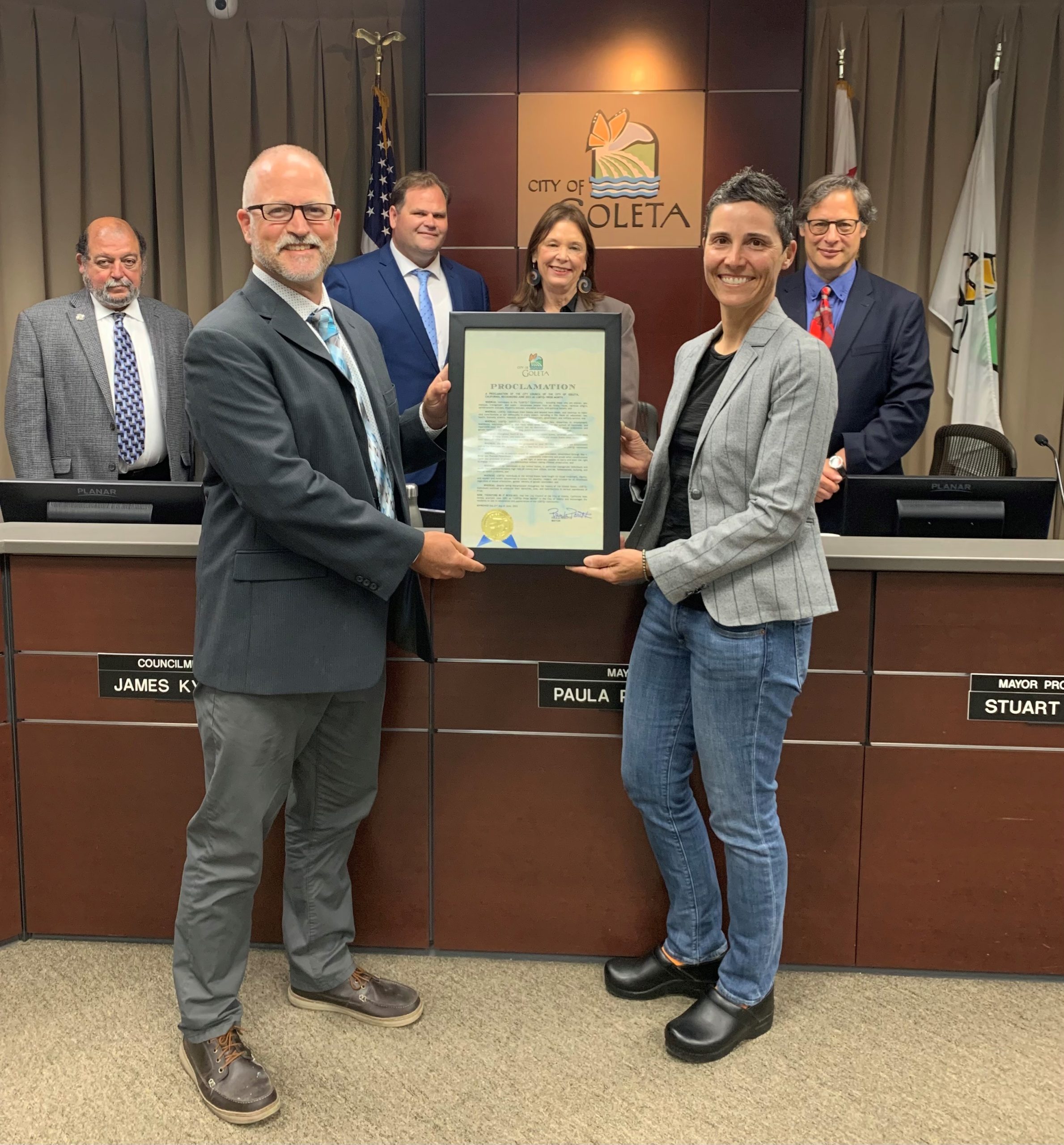 Kristin Flickinger, Executive Director of the Pacific Pride Foundation, receiving the proclamation from the Goleta City Hall