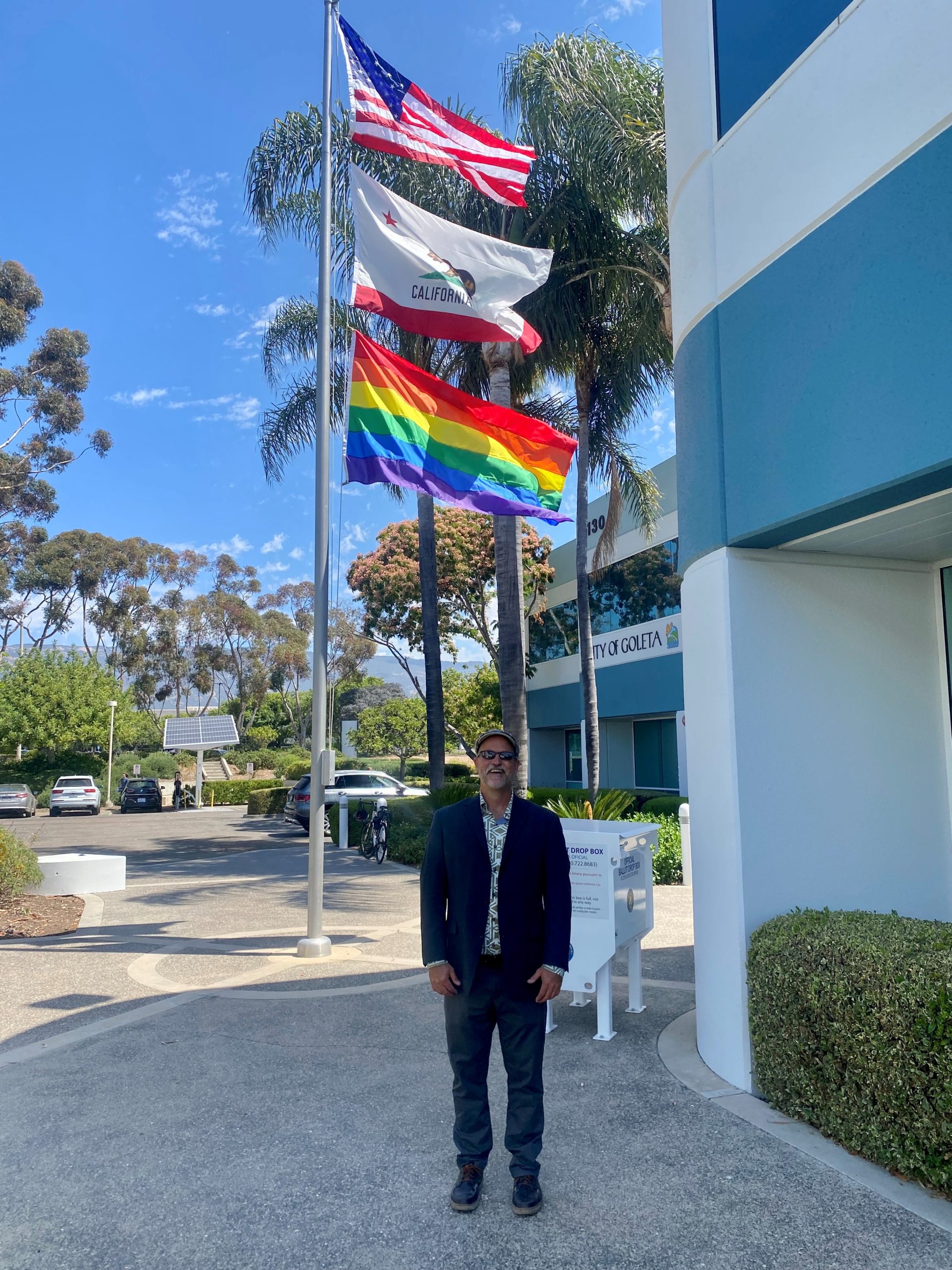 Councilmember Kyle Richards with the newly raised Pride Flag at Goleta City Hall
