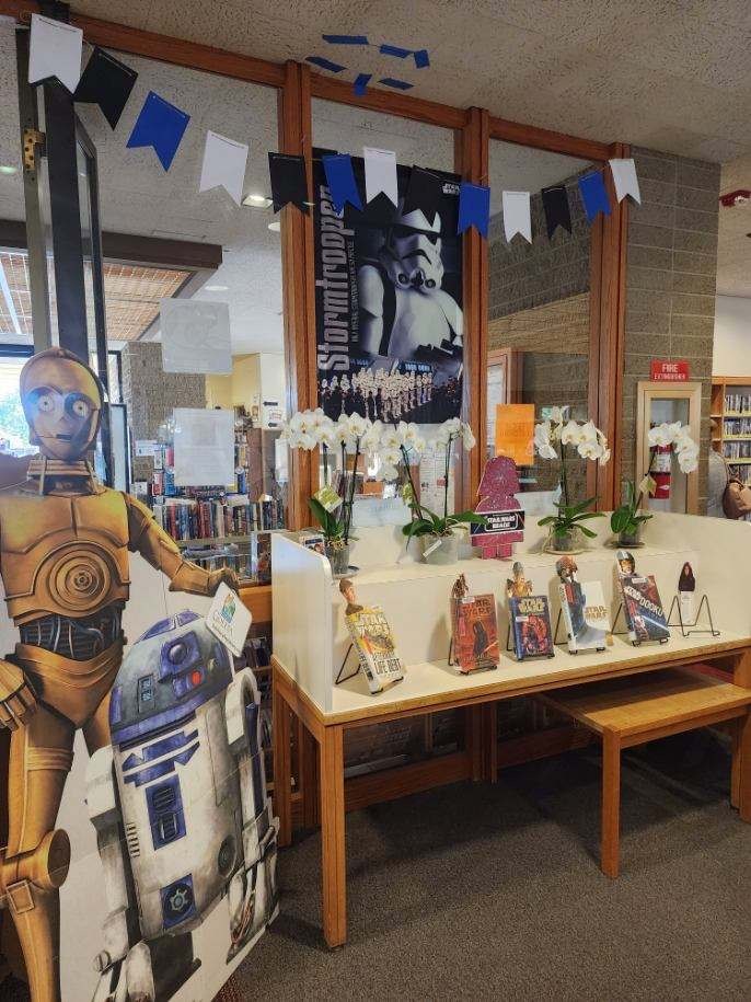 Plus, Jedi of all ages are invited to stop by the library all month long to check out Star Wars books, graphic novels, and movies from our displays for children, adults, and teens. While you are here, enjoy the most fantastic decorations in the galaxy! The library is currently bedecked with life-size droids, giant light sabers, and vibrant posters featuring your favorite heroes and villains from the Star Wars universe.