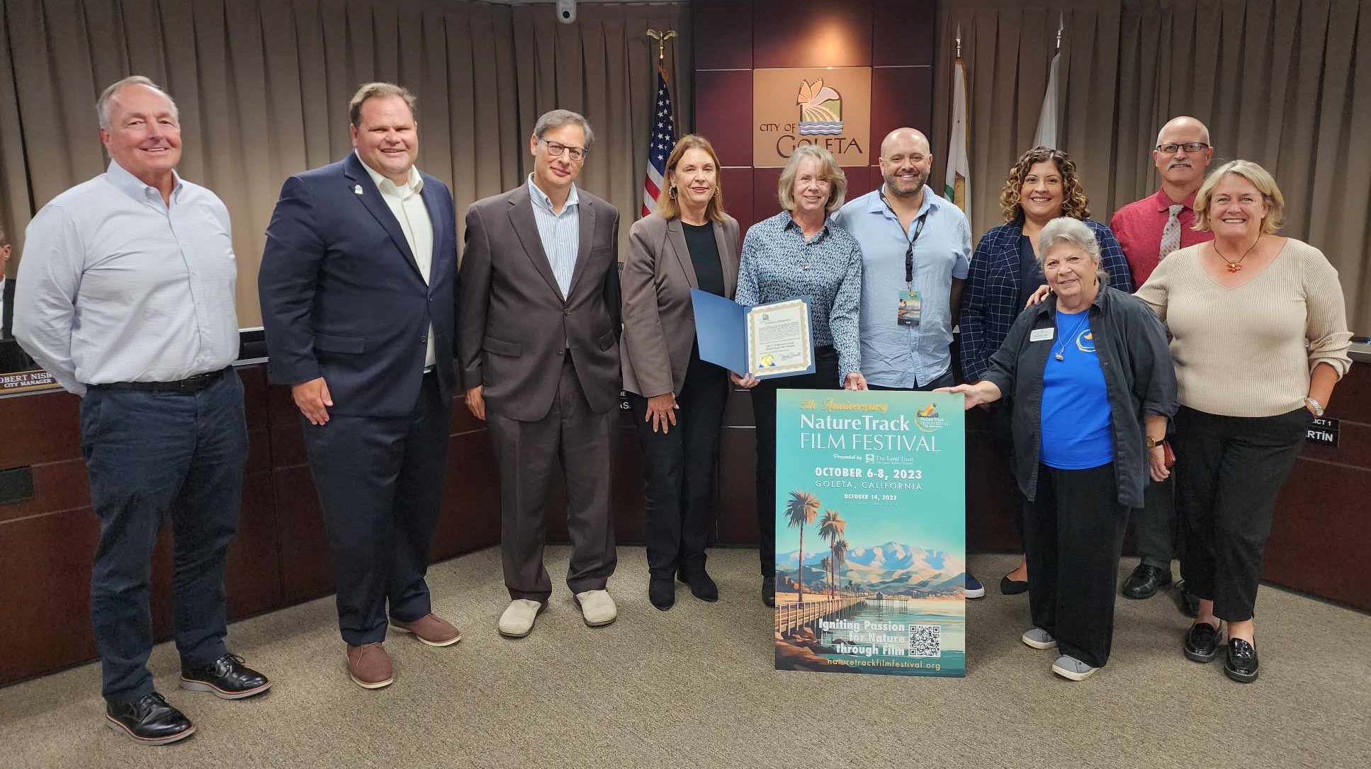 City Council and NatureTrack Film Festival representatives with the Certificate of Recognition from the September 19, 2023, City Council meeting. Pictured left-to-right: Greg Parker (Land Trust for Santa Barbara County Board of Trustees), District 2 Councilmember James Kyriaco, Councilmember Stuart Kasdin, Mayor Paula Perotte, Sue Eisaguirre (Founder and Executive Director of NatureTrack), Gareth Kelly (Development Director for the NatureTrack Film Festival), District 1 Councilmember Luz Reyes-Martín, Maureen “Mo” McFadden (NatureTrack Communications Director), and Carrie Mullen (Development and Communications Director for the Land Trust for Santa Barbara County)