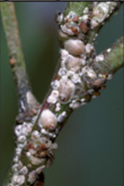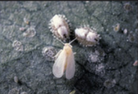 Adult whiteflies are about 1/8th with four white wings. The immovile nymphs have a protective cover which looks waxy, cottony, or hair like. Giant Whiteflies make long waxy strands on the underside of the leaf. Adults and larvae are found on the underside of leaves.