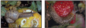 Snails have a protective shell which slugs lack. Muscular foot on snails excretes mucus, and leaves a silvery trail when dry. Snails and slugs Hide in shady damp place during the day and feed on plants at night.