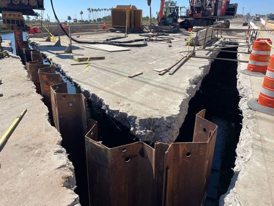 Construction to replace the San Jose Creek Bridges on State Route 217 in Goleta continues with the installation of sheet piles in preparation for demolition of the northbound bridge expected to begin in mid-October following the transfer of equipment from the westbound side of the bridge to the east side. One lane remains open in each direction for travelers on the westbound side of the highway.