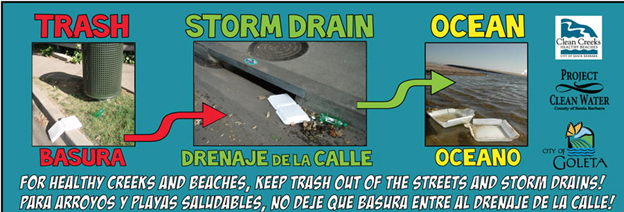 If you observe stormwater concerns such as trash, illegal dumping, or any fluid with a visible sheen, odor, or color entering the storm drain within the City of Goleta, please report it. Water pollution should be reported to the City at environmentalservices@cityofgoleta.org. Hazardous Materials Spills should be reported to 911. Sanitary sewer (wastewater) spills should be reported to the Goleta Sanitary District (805-967-4519) or Goleta West Sanitary District (805-968-2617) immediately.