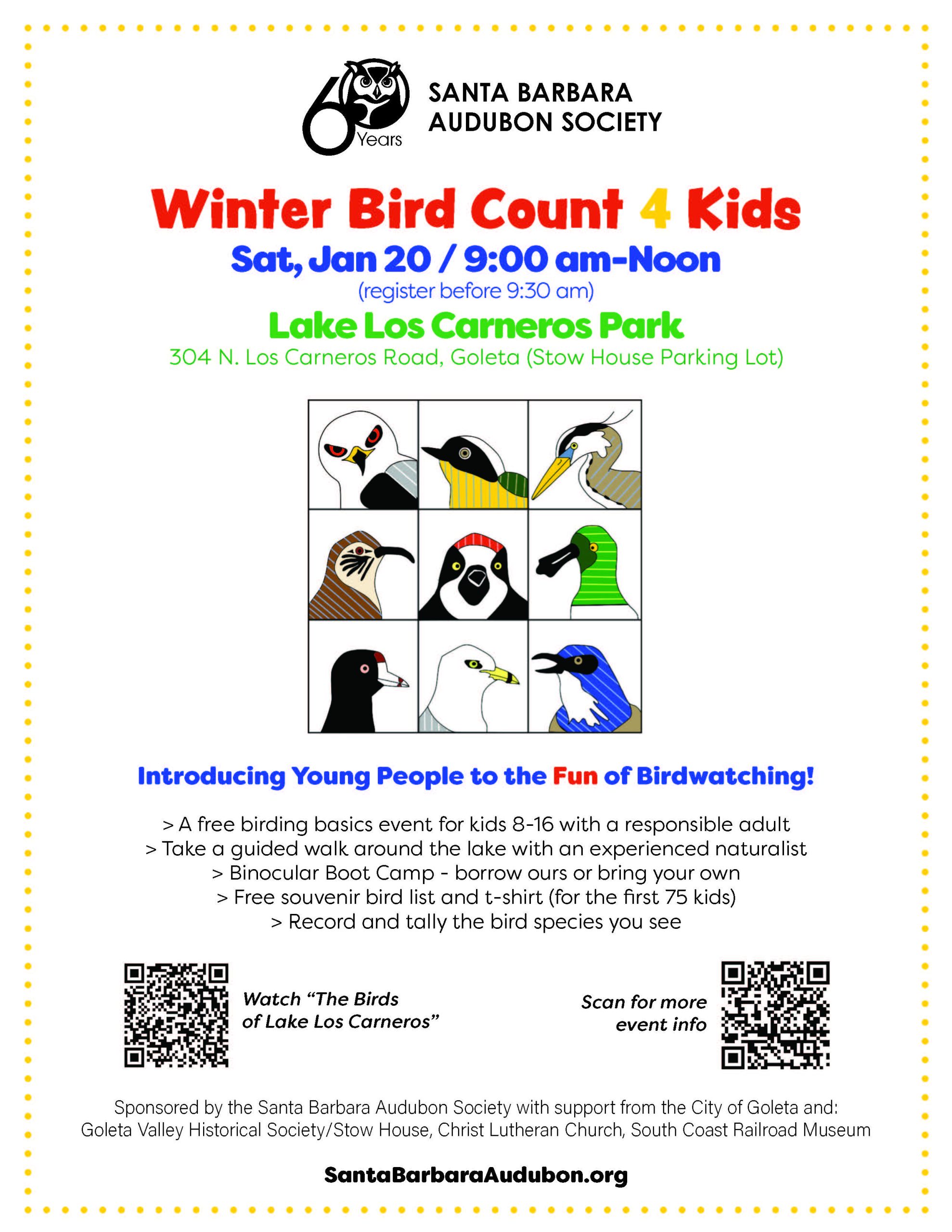 The Santa Barbara Audubon Society is having its 10th Annual Winter Bird Count for Kids on January 20, 2024, from 9:00 a.m. – 12:00 p.m. at Lake Los Carneros.