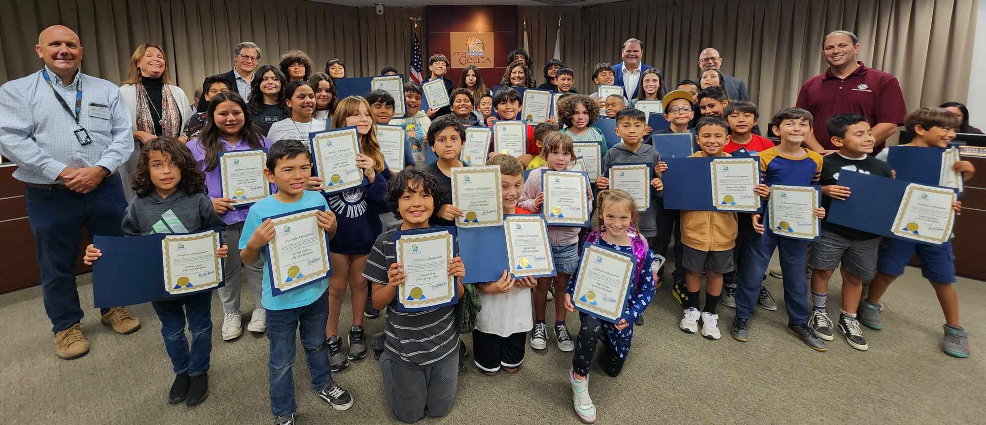 More than seventy United Goleta Boys & Girls Club of Santa Barbara County members and their families packed the Goleta City Council Chambers on November 7, 2023, for a special ceremony. The Mayor and Goleta Councilmembers took turns reading the names of 73 club members ages K – 12th grade who were recognized for their outstanding attendance record at the Goleta Club location at 5701 Hollister Avenue in Old Town. Applause erupted as each name was announced and photos were taken. In addition to receiving a Certificate of Recognition from the City, the students received a prestigious Gold Card acknowledging 105 days or more in the program this year.