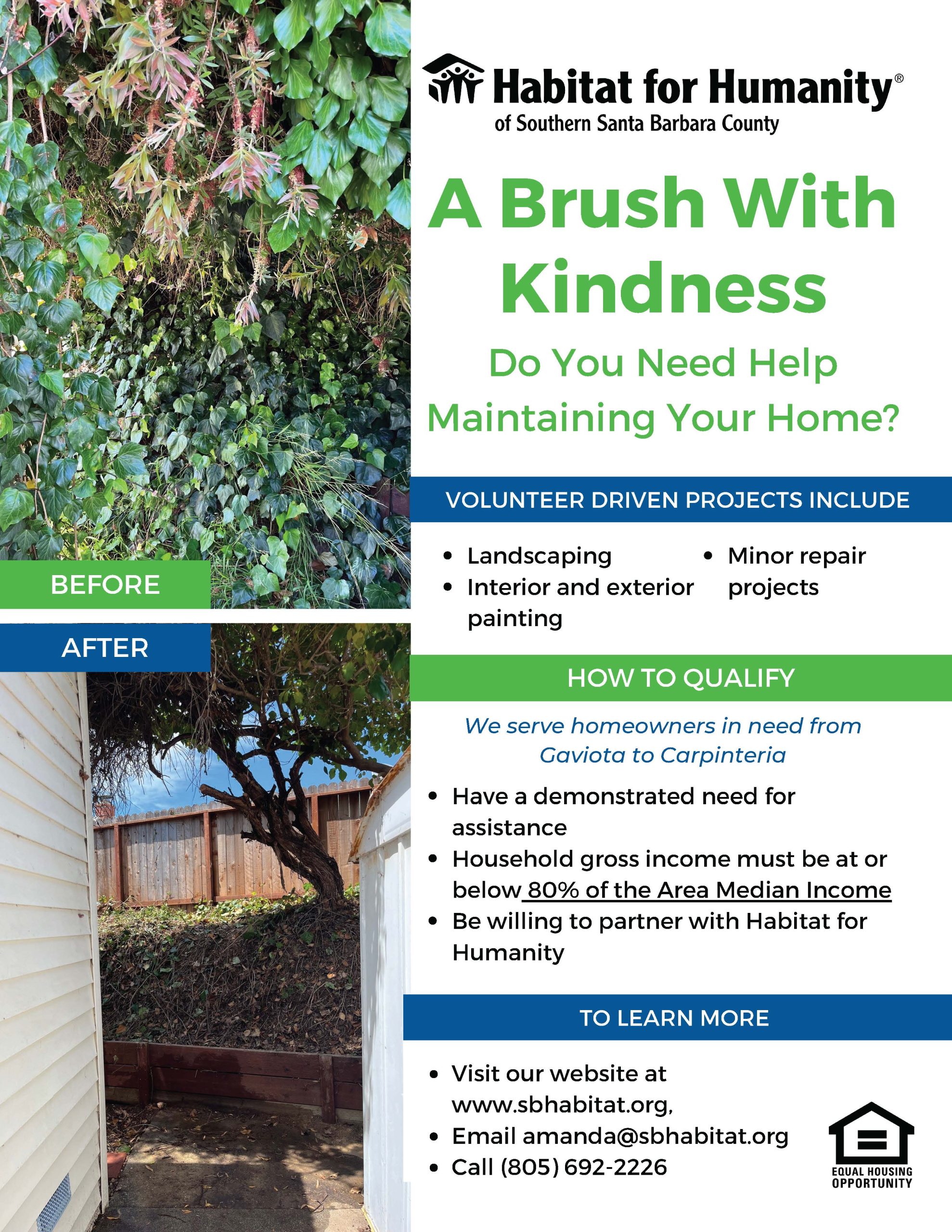 Habitat Santa Barbara is currently accepting applications for A Brush with Kindness. A Brush with Kindness (ABWK) is a free exterior home preservation service offered to eligible low-income homeowners in Goleta and on the Santa Barbara South Coast, who are struggling to maintain their home. These improvements are led with the support of Habitat volunteers at no cost to the homeowner, and cover small scale projects such as painting, landscaping, and minor repairs and maintenance, grab bar installation, and more.