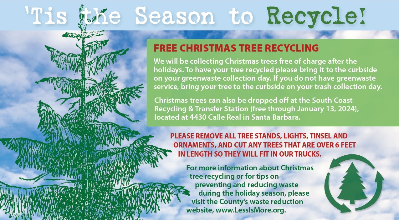 Christmas trees can also be dropped off at the South Coast Recycling and Transfer Station (free through January 13, 2024) at 4430 Calle Real in Santa Barbara.