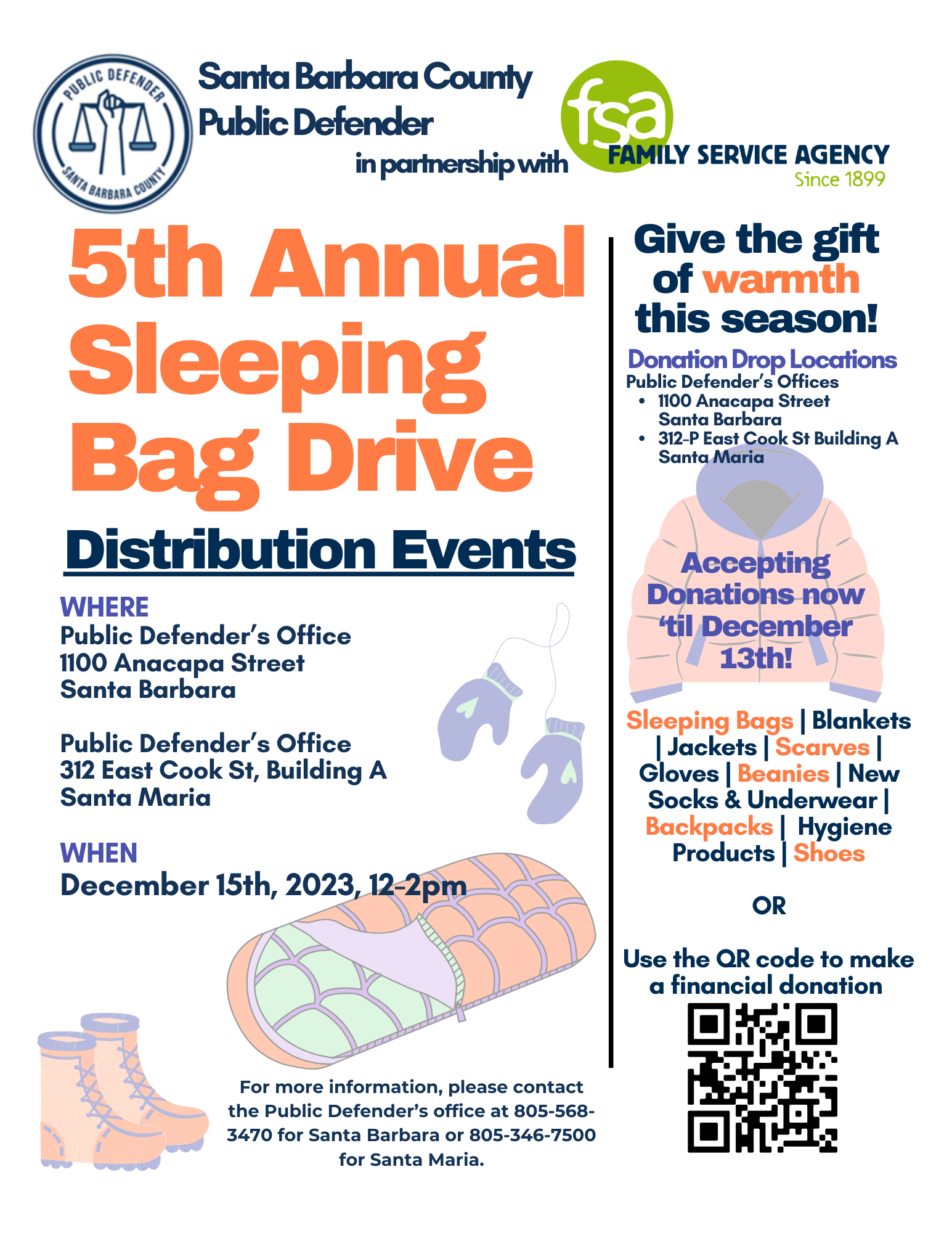 New or lightly used donations are being accepted during regular business hours from 8 a.m. to 5 p.m. Monday through Friday at the Public Defender’s offices. The Santa Barbara office is located at 1100 Anacapa Street. The Santa Maria office is located at 312-P East Cook Street, Building A. Physical donations may be made through 5 p.m. on Wednesday, December 13. Financial donations will also be accepted, for the purchase of new sleeping bags and undergarments, and are tax-deductible through the Public Defender’s partnership with the Family Service Agency of Santa Barbara. Financial donations may be made online through the following website, 2023 Sleeping Bag Drive | Family Service Agency (givebox.com). Donations of items will not be accepted at the Family Service Agency.