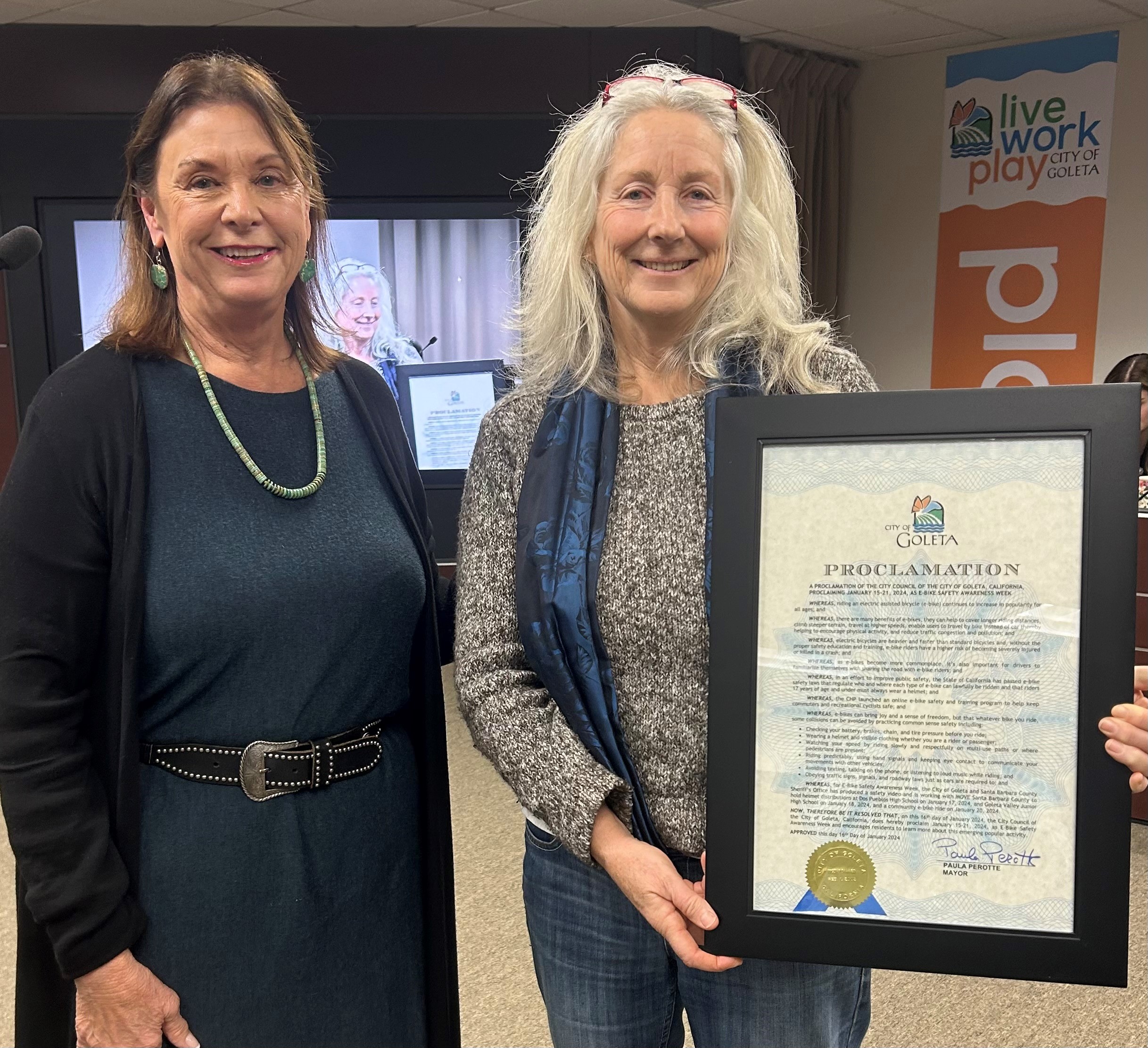 At the reading of the proclamation at the Goleta City Council Meeting on January 16, Mayor Paula Perotte said, “Electric bicycles are heavier and faster than standard bicycles and, without the proper safety education and training, e-bike riders have a higher risk of becoming severely injured or killed in a crash.”