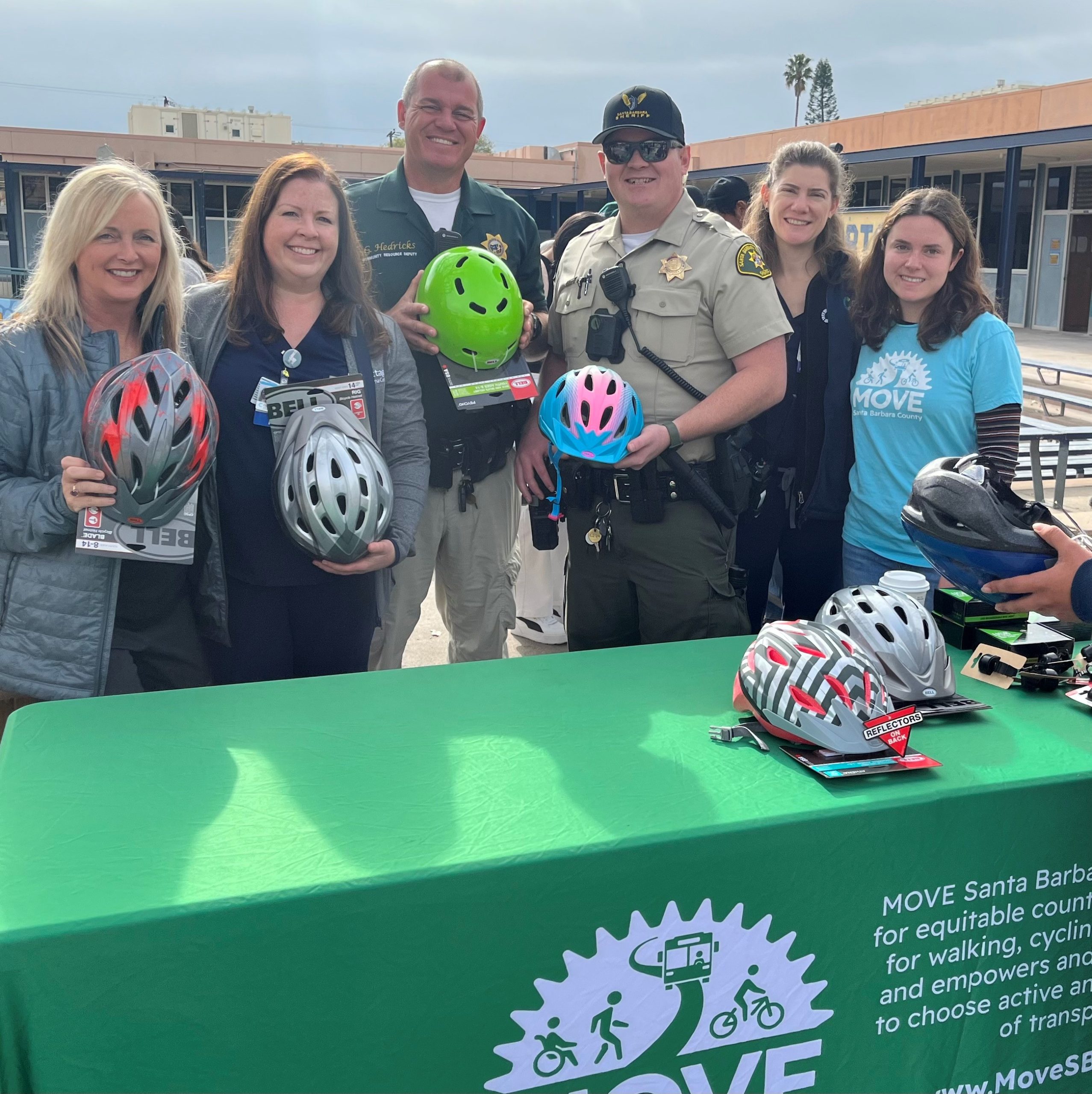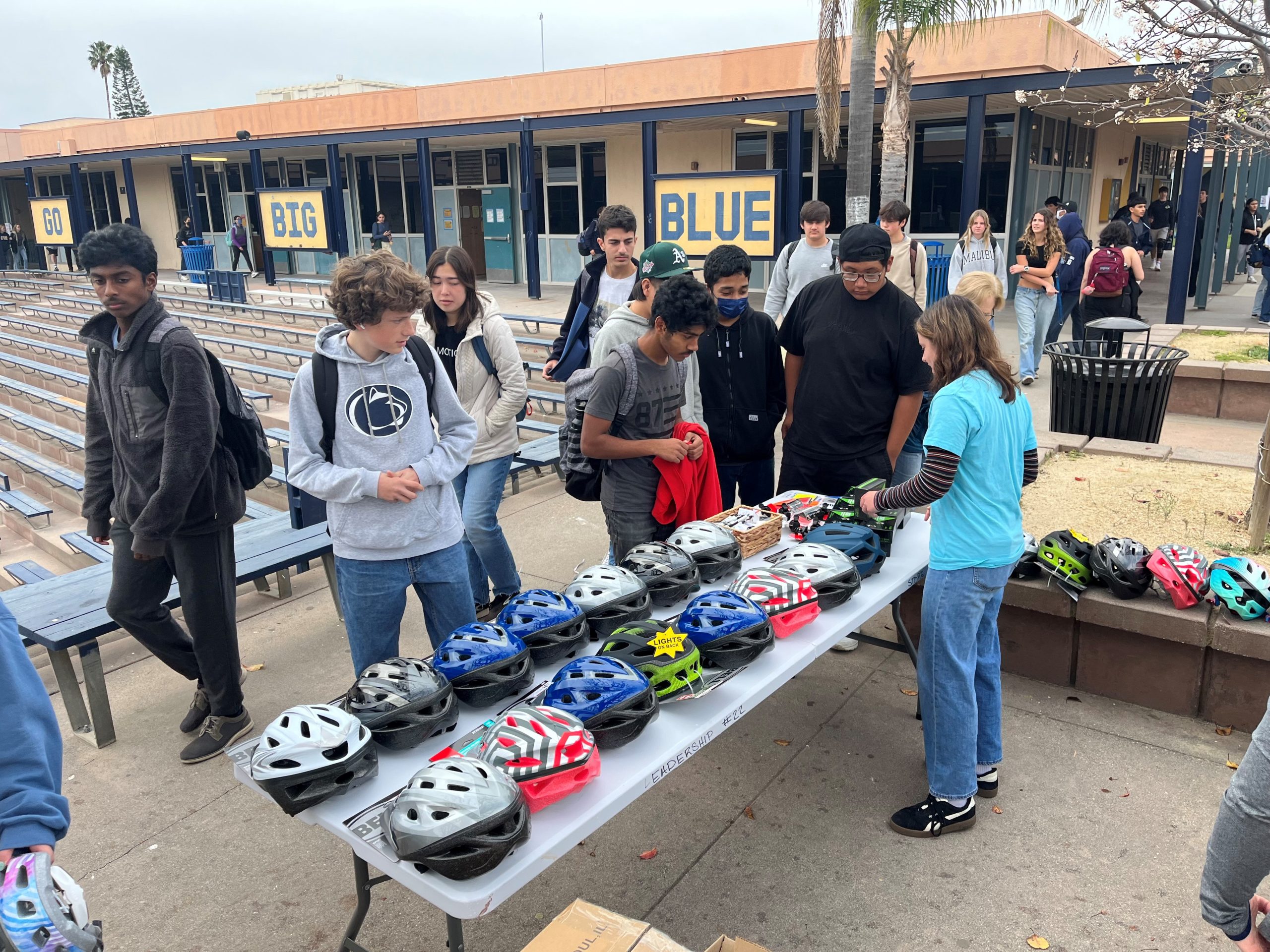 Representatives from the City of Goleta, MOVE Santa Barbara County, Goleta Police, CHP and Cottage Hospital passing out helmets and lights at Dos Pueblos High School on January 17, 2024