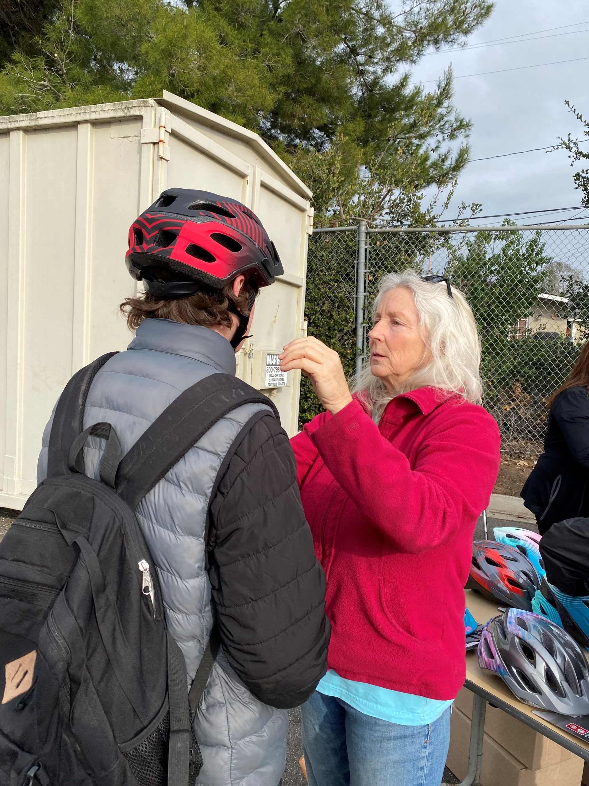 Kim Stanley-Zimmerman making sure a student’s helmet fits properly at the Goleta Valley Junior High School distribution on January 18, 2024