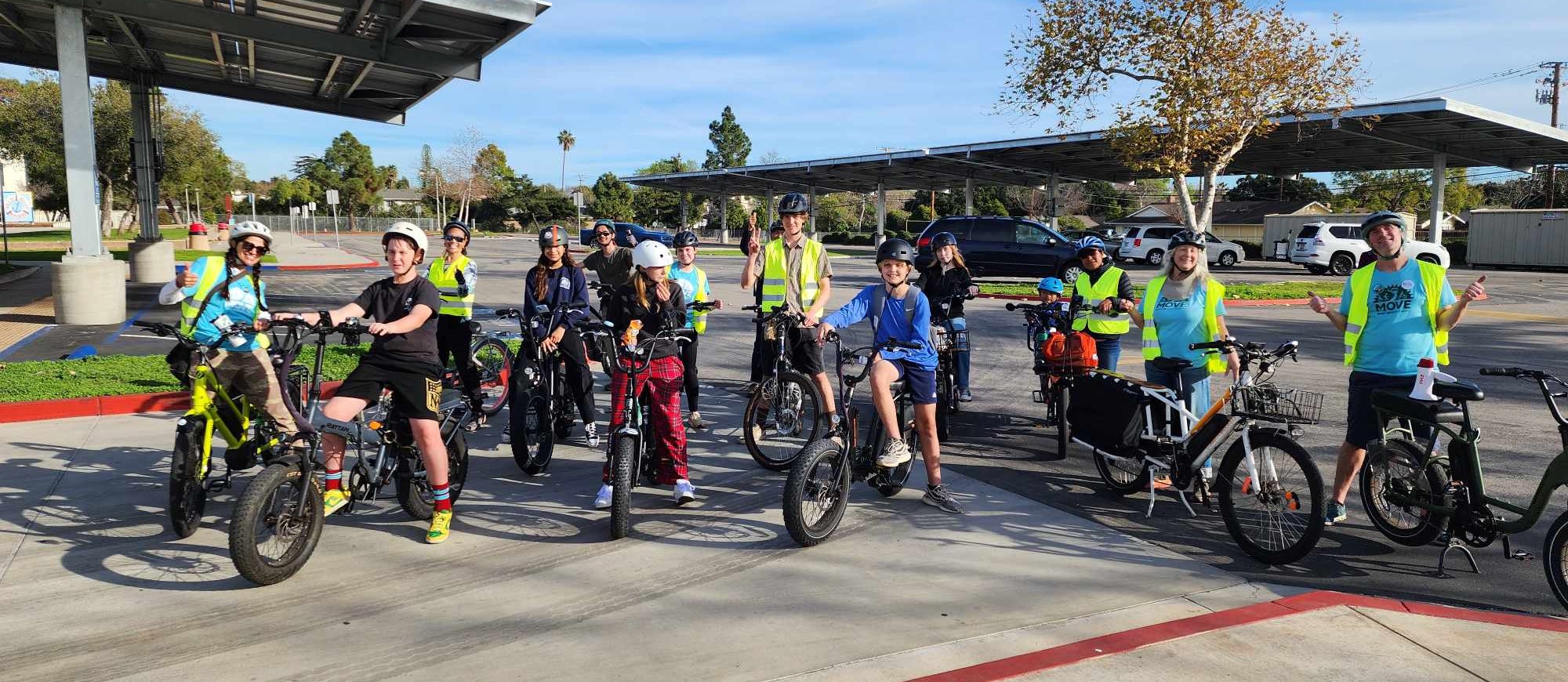 Smiling participants after completing the Community E-Bike Skills Class & Ride on January 27 at Goleta Valley Junior High School