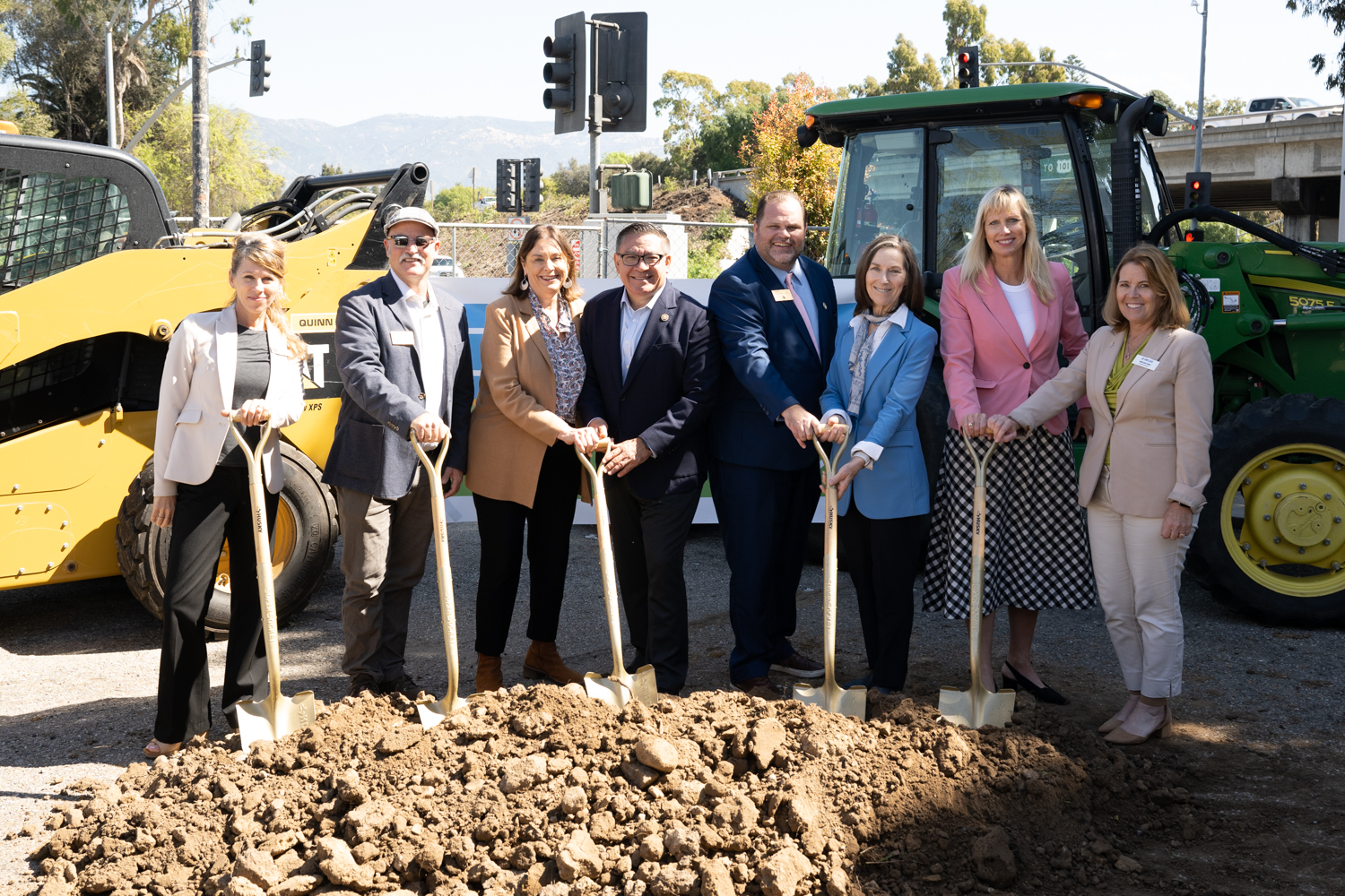 Project Connect Groundbreaking Speakers Pose with Shovels – pictured left-to-right: Meg Henry Caltrans District 5 Project Manager, Councilmember Kyle Richards, Mayor Paula Perotte, Congressman Salud Carbajal, Councilmember James Kyriaco (District 2), Santa Barbara County Supervisors Joan Hartmann (District 3) and Laura Capps (District 2) and Marjie Kirn with Santa Barbara County Association of Governments