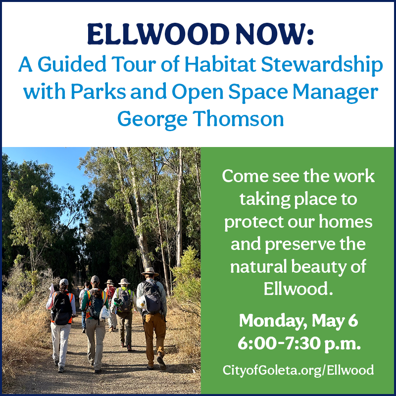 Join the City for Ellwood Now: A Guided Tour of Habitat Stewardship. Get a behind-the-scenes look at the active work taking place now at Ellwood with the City’s Parks and Open Space Manager George Thomson. Attendees will learn about the meticulous steps being taken to reduce wildfire risk, from clearing flammable materials to mowing grass to trimming and thinning trees. See firsthand the actions taking place to protect homes and preserve the natural beauty of Ellwood.