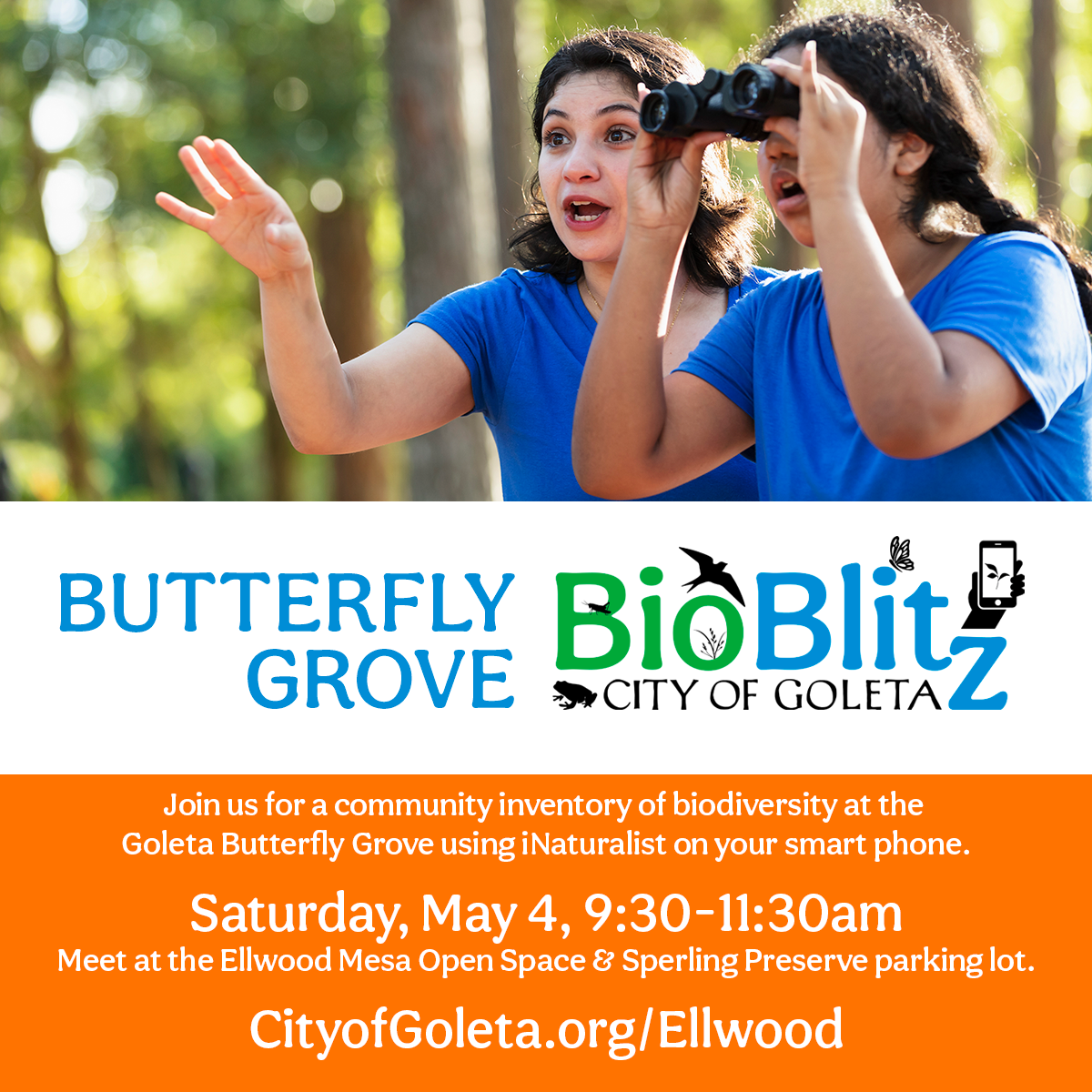 The City of Goleta has two events planned at Ellwood Open Space this month that we don’t want you to miss! Join us for the Butterfly Grove BioBlitz on Saturday morning, May 4, from 9:30 – 11:30 a.m. and for a guided tour of Ellwood on Monday evening, May 6 from 6:00 – 7:30 p.m. More details on each of these free community events below.