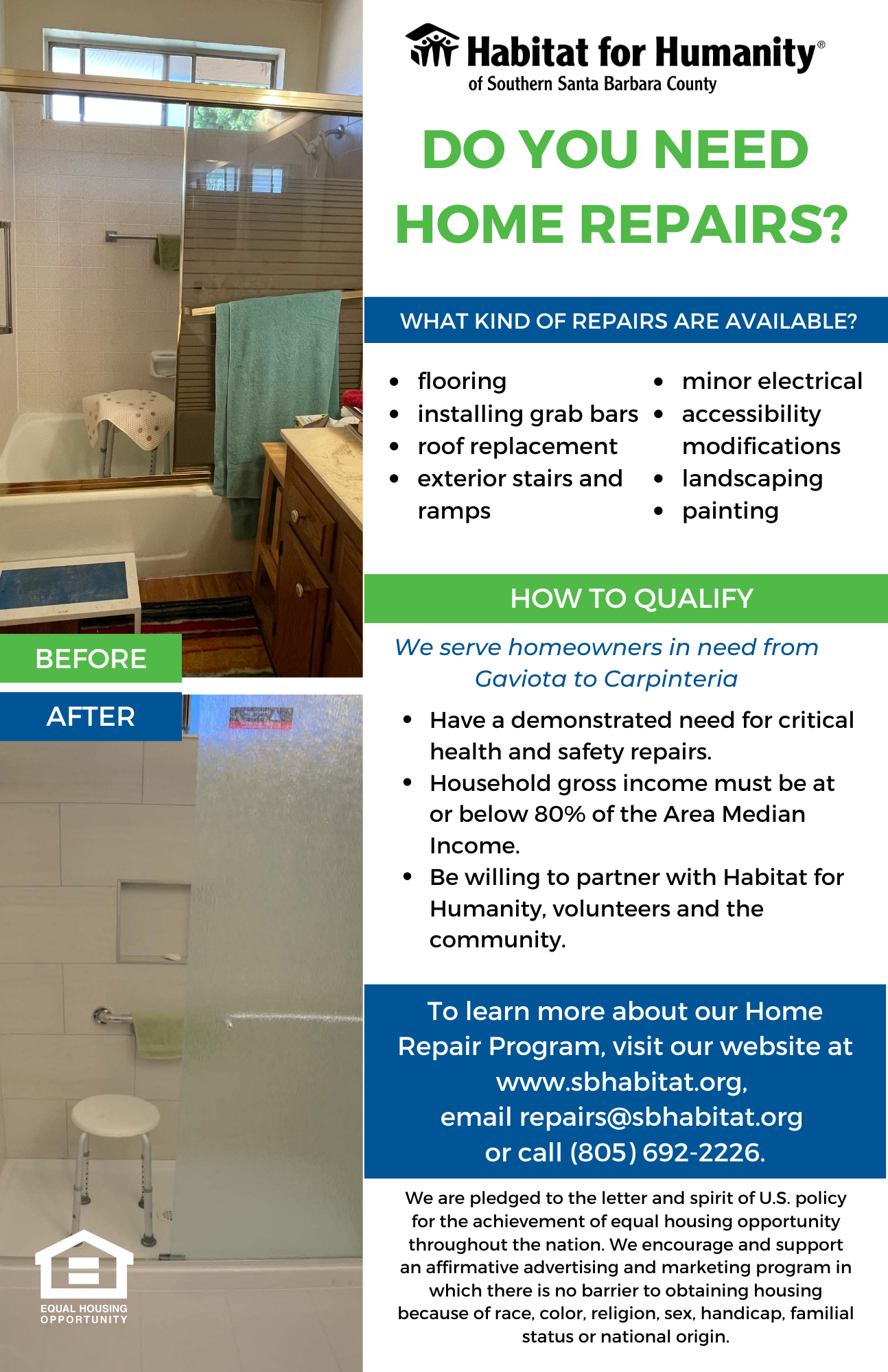 More information on the program is available at www.sbhabitat.org/programs/home-repair. To contact someone at Habitat for Humanity of Southern Santa Barbara County, email repairs@sbhabitat.org or call (805) 692-2226.