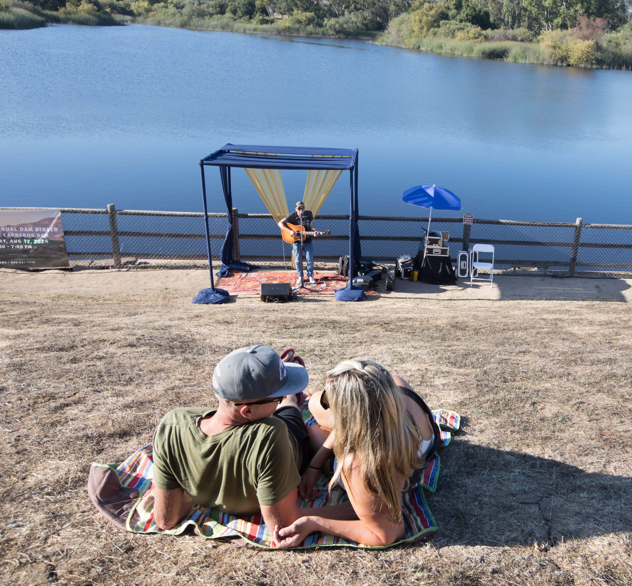 Whether they brought their own picnic dinner or purchased food, attendees found a spot at the long community table decorated with yellow and blue checkered tablecloths. It was a warm evening, and over 300 attendees enjoyed shaved ice courtesy of Kona Ice. For the second year, the City placed reusable cutlery sets at each seat at the table to promote the City’s Plastic Free ordinance. Another highlight this year was moving the live music to a decorative shaded structure down by the lake where everyone could see. A big thanks to long-time musician Nate Latta who entertained the Dam Dinner guests during the event and did a great job!