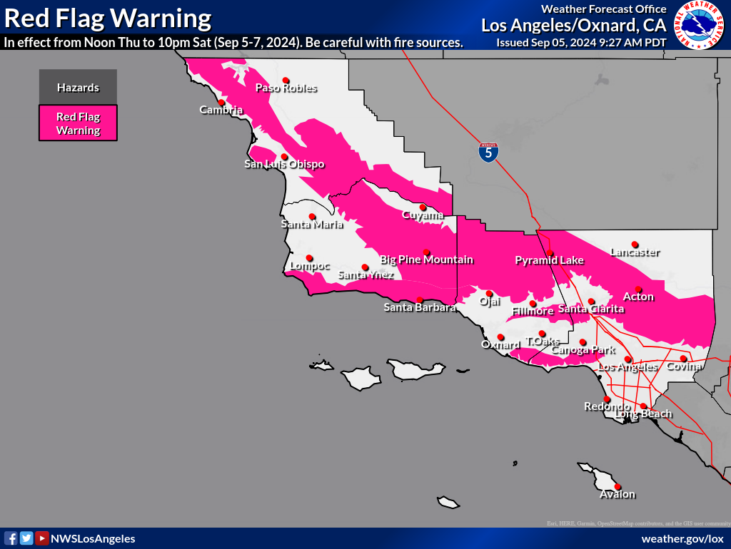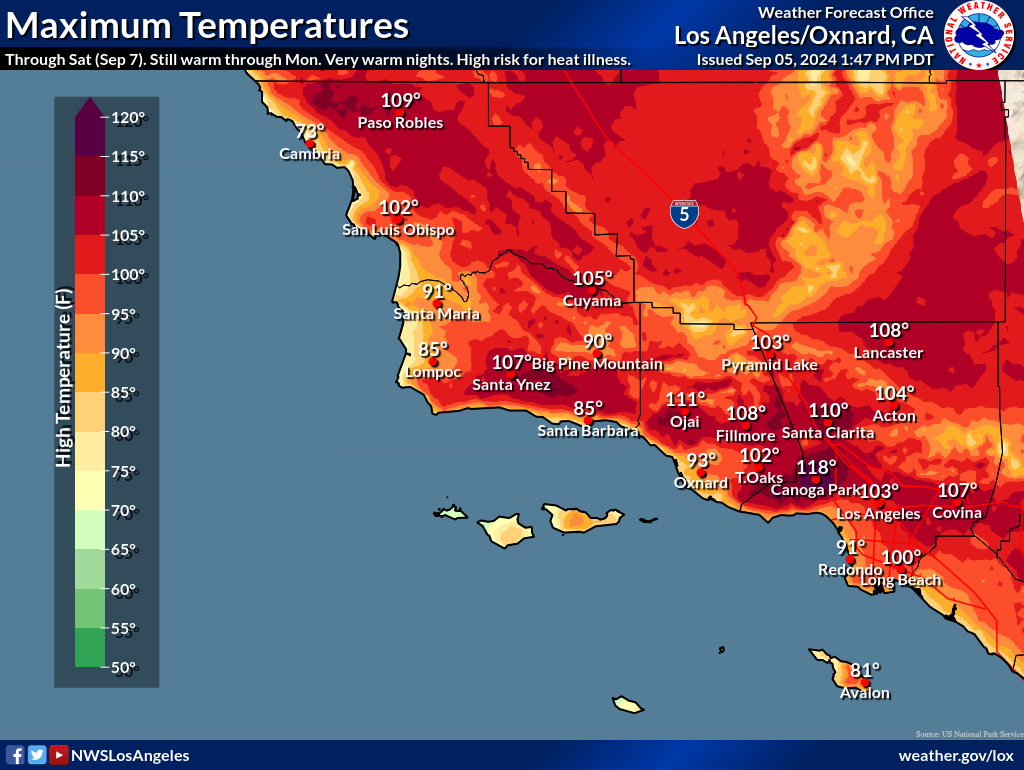 The National Weather Service has expanded the Heat Advisory for the coastal areas of Santa Barbara County, including Goleta, and the Excessive Heat Warning for inland areas, through Monday, September 9. The National Weather Service has also issued a Red Flag Warning for southern Santa Barbara County due to strong sundowner winds, low humidity, and high temperatures. This Warning is in effect now through Saturday, September 7. Detailed weather forecasts are available at https://www.weather.gov/lox/.