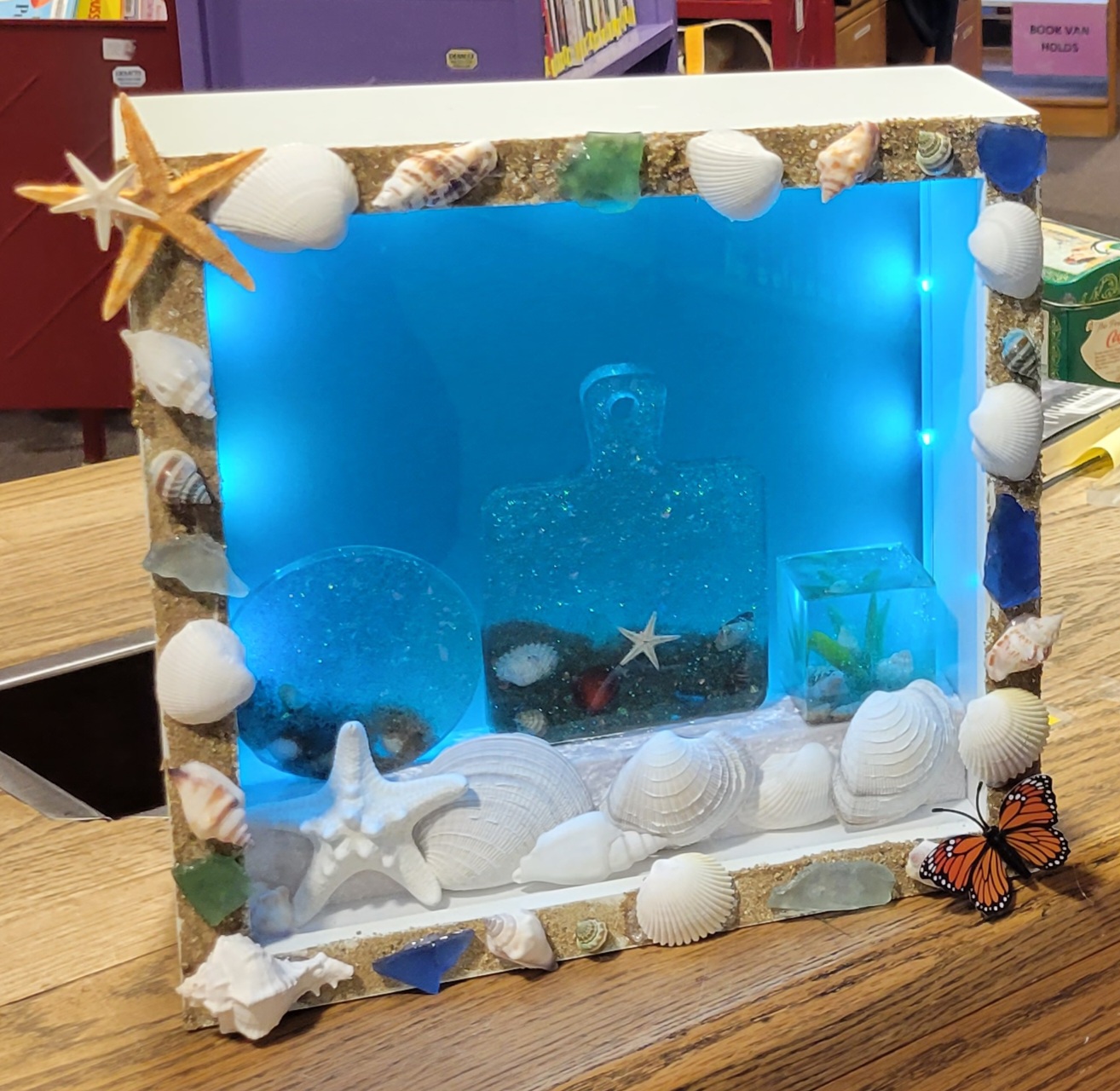 Out of the 114 submissions, 5th grade Isla Vista Elementary School student Ronnie Gloo won the People’s Choice Award. Her art piece was a customized LED-backlit shadow box holding three unique epoxy resin designs. She created this one-of-a-kind piece by combining what she learned about epoxy resin in Laguna Blanca’s Ocean Potion summer camp and about copper wire battery-powered LED lights in her 4th grade STEAM class with countless visits to Goleta beaches and UCSB’s REEF interactive aquarium. Everything you see is inspired by something you can find at our beaches, including seashells, sea glass, sand, and Monarch Butterflies.